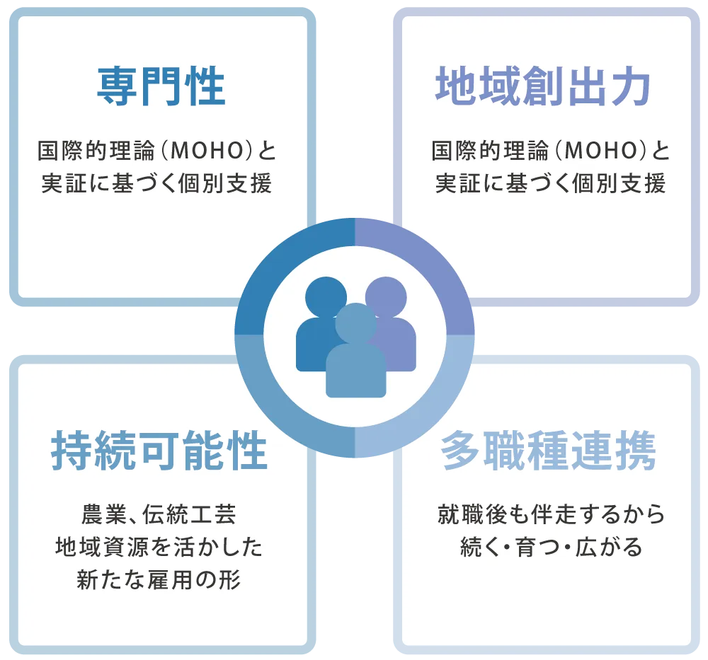 具体的には、就労の機会の創出および生産活動への参加機会の提供、さらに就労における基礎的スキルや能力の向上を目的とした訓練プログラムを実施し、個々の特性や課題に応じた支援を行います。